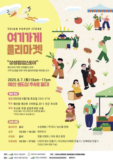 [무한뉴스=정민정 기자] 예산군은 오는 7일 오전 10시부터 오후 5시까지 예산읍 추사거리(예산로 194번길) 일원에서 ‘여기가게 플리마켓’ 행사가 열린다고 밝혔다.