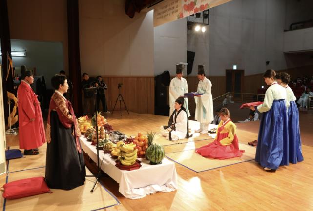 홍주향교 이철학 전교님의 주례와 꽃맘 월전 권혜숙님을 계자빈으로 모시고 성년자를 대표해 유통경영학과 유시현군과 간호학과 이수경양이 관자와 계자를 맡아 진행됐다.