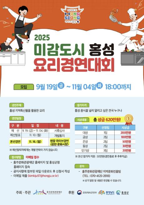 [무한뉴스=정민정 기자] 홍성군은 내달 4일까지 ‘2025년 미감도시 홍성 요리경연대회’의 참가자를 추가 공개 모집한다고 밝혔다.