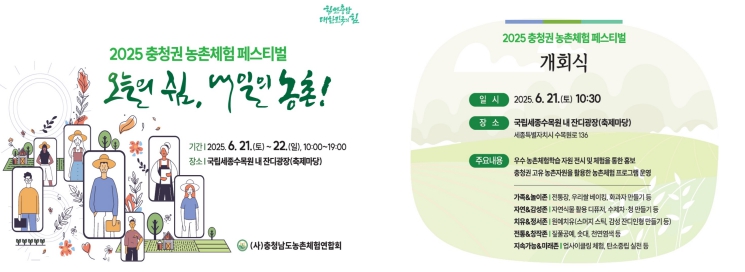 김성열 충남농촌체험연합회장은 “참가 농가들이 직접 준비한 다양한 프로그램을 통해 관람객들이 힐링하고, 농촌의 새로운 가능성을 발견하는 계기가 되길 바란다”며 “앞으로도 충남 농촌체험이 지속가능한 관광자원으로 자리 잡도록 노력하겠다”고 말했다.
