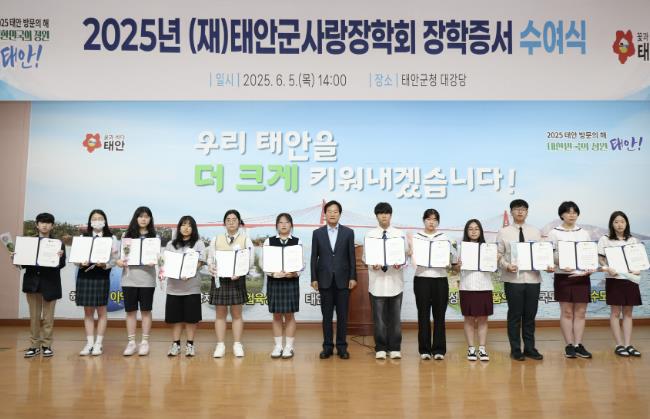 군은 지난 5일 군청 대강당에서 장학회 관계자와 장학생, 학부모 등 200여 명이 참석한 가운데 ‘(재)태안군사랑장학회 2025년 장학금 장학증서 수여식’을 개최했다고 밝혔다.