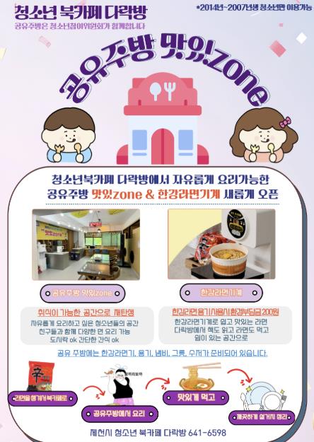 한편, 청소년 북카페 ‘다락방’은 제천시에서 직접 운영 중인 청소년 전용 공간으로 제천시 청소년 정책제안 콘서트에서 제안된 아이디어를 반영해 조성되어 운영중이며, 공유주방 운영에 필요한 라면 조리기와 냄비 등은 지역사회의 후원과 협력을 통해 마련됐고 추가적으로 필요한 물품 등은지역자원을 적극활용 할 예정이다.