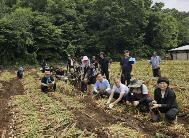 또 김문근 군수와 군청 직원들, 서울시 새마을부녀회 회원들도 함께 일손을 나누며 마늘 캐기와 수거 작업을 도왔고, 현장의 애로사항을 청취하며 농민들과 격의 없이 소통하는 시간도 가졌다.