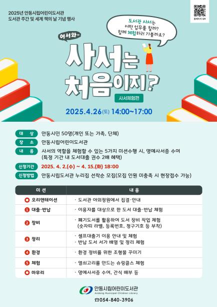 [무한뉴스=최진수 기자] 안동시립 어린이도서관은 ‘2025년 도서관 주간 및 세계 책의 날’을 맞아 사서의 역할을 체험해보는 행사를 4월 26일(토) 오후 2시부터 5시까지 진행한다.