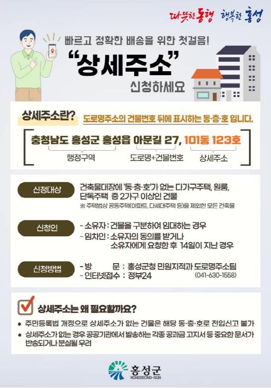 [무한뉴스=정민정 기자] 홍성군은 주민들의 생활 편의와 권리 보호를 위해 ‘상세주소 부여 신청’을 적극 홍보하고 있다고 밝혔다.