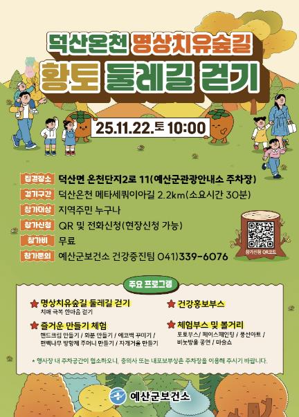 [무한뉴스=정민정 기자] 예산군보건소는 11월 22일 오전 10시 덕산면 명상치유숲길에서 둘레길 걷기 행사를 개최한다고 밝혔다.