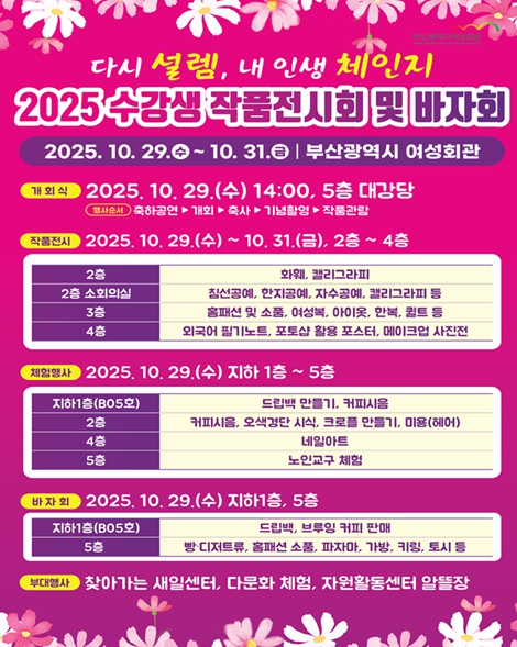 [무한뉴스=최진수 기자] 부산시 여성회관은 수강생들의 배움의 성취와 경제활동 의욕 고취를 위한 '2025년 수강생 작품전시회 및 바자회'를 오는 10월 29일부터 31일까지 '다시 설렘, 내 인생 체인지'라는 주제로 개최한다고 밝혔다.