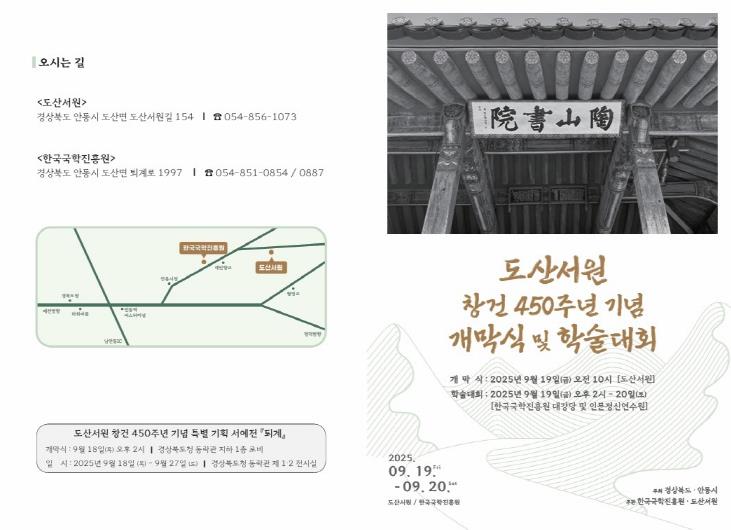 [무한뉴스=최진수 기자] 경상북도와 안동시는 오는 9월 19일 오전 9시 30분 도산서원 일원에서 '도산서원 창건 450주년 고유제 및 기념행사'를 개최한다. 도산서원과 한국국학진흥원이 주관하는 이번 행사는 지역 유림과 학계, 시민이 함께 도산서원과 퇴계 이황 선생의 정신을 기리는 자리로 마련된다.
