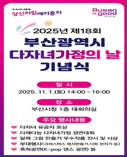 [무한뉴스=최진수 기자] 부산시는 내일(11월 1일) '부산시 다자녀가정의 날'을 맞아 오후 2시부터 4시까지 시청 1층 대회의실에서 '제18회 다자녀가정의 날 기념행사'를 개최한다고 밝혔다.