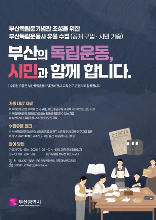 유물 수집은 공개 구입과 기증을 병행하는 방식으로 진행되며, 부산 지역 독립운동의 역사적 가치를 시민과 함께 발굴·기록하고 이를 공공의 자산으로 보존하기 위해 마련됐다.