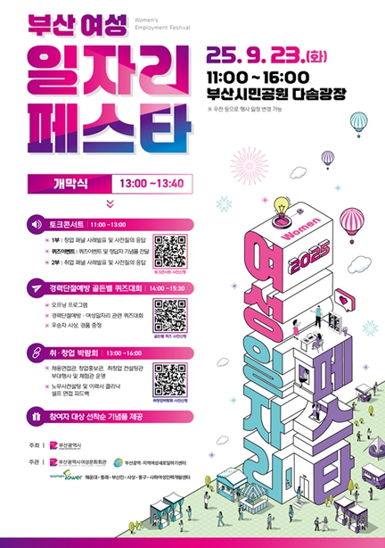 [무한뉴스=최진수 기자] 부산시는 오는 9월 23일 오전 11시부터 오후 4시까지 부산시민공원 다솜마당에서 '2025 부산 여성 일자리 페스타'를 개최한다고 밝혔다.