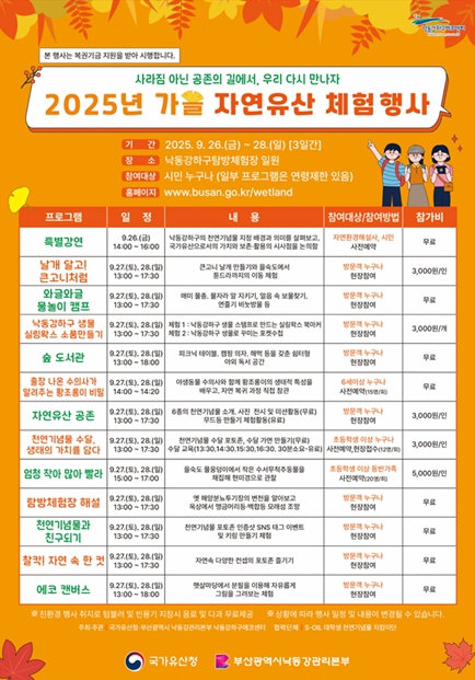 [무한뉴스=최진수 기자] 부산시 낙동강관리본부는 '2025년 가을 자연유산 체험행사'를 오는 9월 26일부터 28일까지 을숙도 낙동강하구탐방체험장 일원에서 개최한다고 밝혔다.