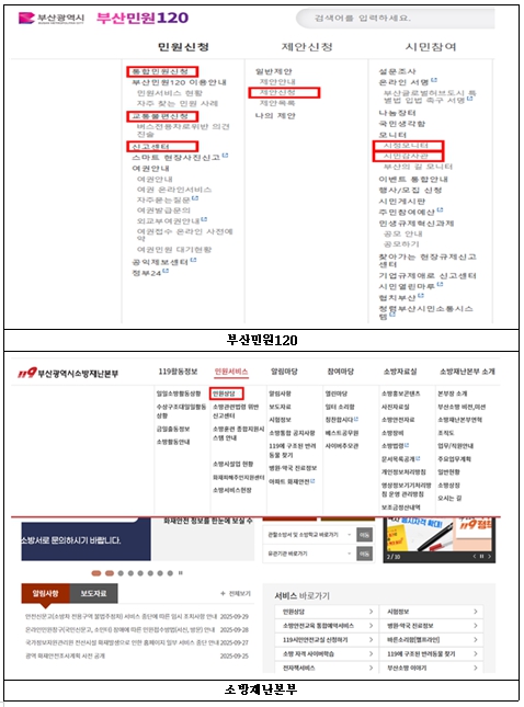보다 자세한 내용은 각 기관(부산민원120, 소방재난본부, 상수도사업본부) 누리집 공지사항을 통해 확인할 수 있으며, 전화 문의는 시 통합민원과로 하면 된다.