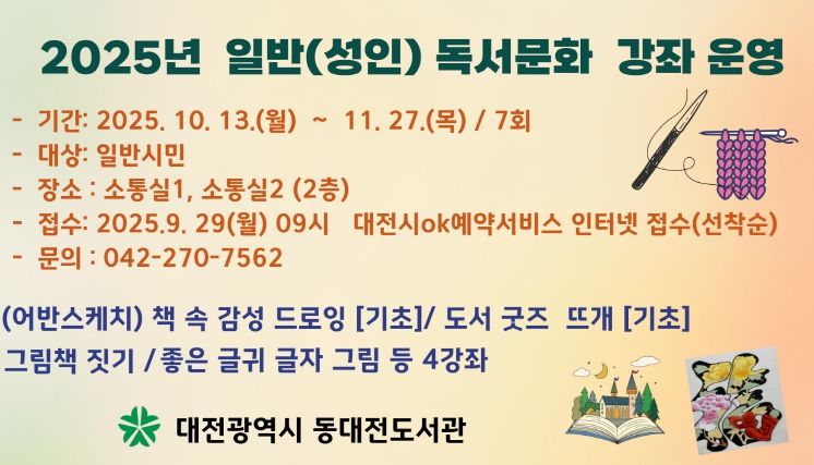 운영 과정은 ▲책 속 감성 드로잉(어반스케치 기초) ▲도서 굿즈 뜨개(기초) ▲그림책 짓기 ▲좋은 글귀 글자 그림 등 4개 강좌로 구성된다. 강의 종료 후에는 수강생 주도의 자율 동아리 결성도 지원할 예정이다.