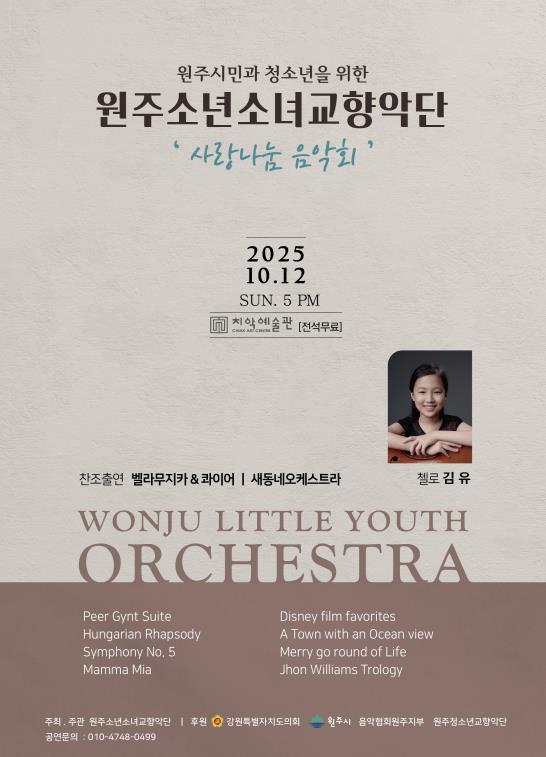 [무한뉴스=정민정 기자] 원주소년소녀교향악단은 오는 12일 오후 5시, 치악예술관에서 ‘사랑나눔음악회’를 통해 지역사회와 함께하는 따뜻한 무대를 마련한다.