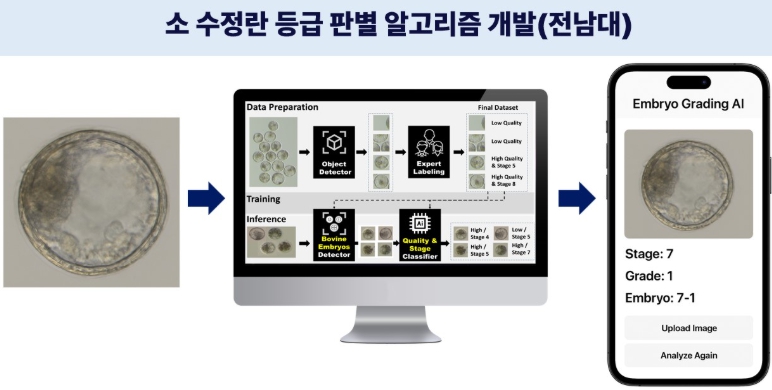 연구는 세계수정란이식학회(IETS)에서 제시한 발달단계(stage)와 등급(grade) 기준에 따라 데이터를 분류했으며, 수정란 생산 경력 10년 이상의 전문가 검토와 더불어 전남대·한경대 연구진, 경상북도 축산기술연구소, ㈜라트바이오, ㈜아리프, ㈜젠터 등 기업이 참여해 이미지 데이터를 제공하고 검증을 수행했다.