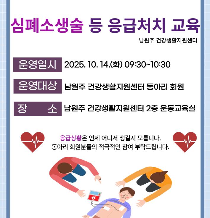 교육 내용은 가슴 압박 소생술과 자동심장충격기 사용법이며, 참가비는 무료다. 센터 내 동아리 회원이 대상이며, 추후 지역 주민을 대상으로 한 교육을 마련할 예정이다.