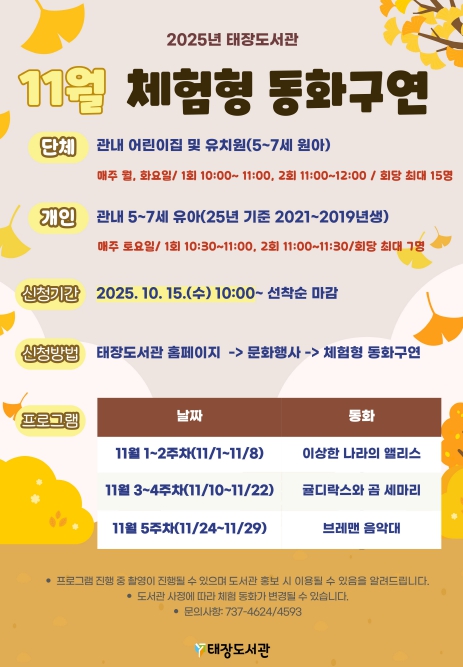 | ▲ 원주시 태장도서관, 11월 체험형 동화구연 운영 |