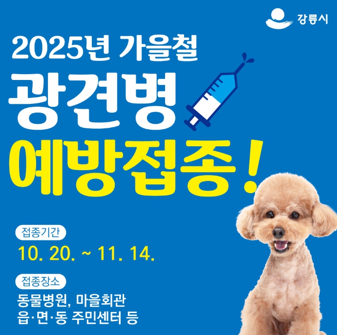 [무한뉴스=정민정 기자] 강릉시는 인수공통전염병으로 알려진 광견병으로부터 시민과 반려동물을 안전하게 보호하기 위해 오는 10월 20일부터 11월 14일까지 4주간 가을철 광견병 예방접종을 실시한다.