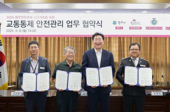 [무한뉴스=정민정 기자] 원주시는 오는 10월 24일부터 26일까지 열리는 ‘2025 원주만두축제’의 성공적인 개최를 위해 지난 8일 시청 7층 투자상담실에서 원주시자율방범연합대 및 (사)원주모범운전자회와 교통 통제·안전관리 협약을 체결했다.