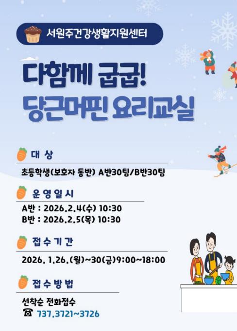 [무한뉴스=정민정 기자] 서원주건강생활지원센터는 겨울방학 중 아이들의 올바른 식습관 형성을 돕기 위해 ‘다함께 굽굽! 당근머핀 요리교실’ 프로그램을 운영한다.