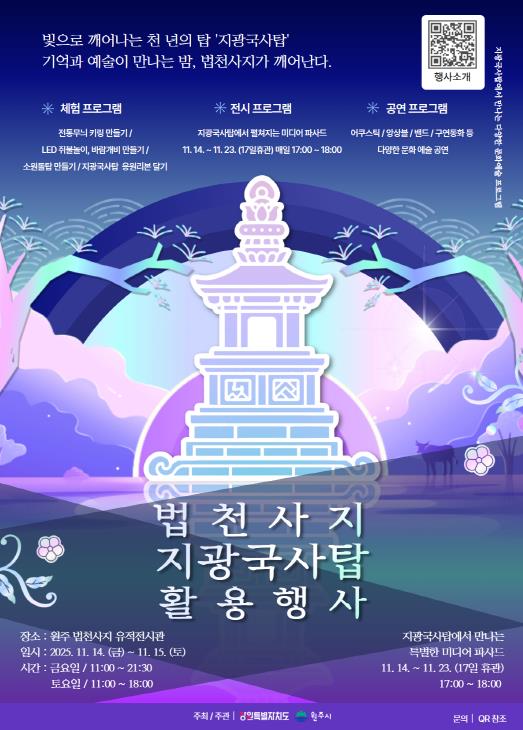 원주시역사박물관은 국가지정유산(사적)인 원주 법천사지와 국가지정유산(국보) 지광국사탑, 지광국사탑비의 역사·문화적인 의미와 가치를 널리 알리기 위해 행사와 미디어파사드 전시를 개최한다.