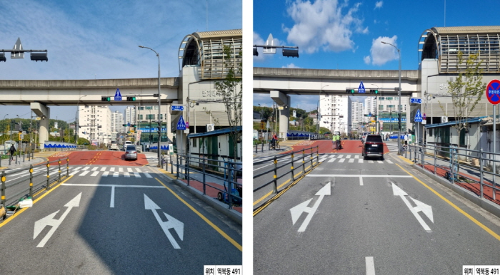 | ▲ 횡단보도와 차량정지선 이격거리를 5m로 확대한 처인구 역북동 491번지의 모습. 사진은 이격거리 확대 전(좌)과 확대 후(우)의 모습. |