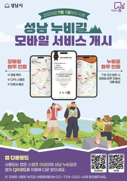 이 서비스는 ‘모바일 스탬프 여권 앱’ 연동을 통해 성남 누비길 경로 안내와 7개 지점별 인증 도장 찍기, 완주 인증서 발급을 지원한다.