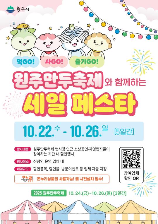 [무한뉴스=정민정 기자] 원주시는 지역 대표 축제인 원주만두축제와 연계해 구도심 상권을 활성화하기 위해 오는 22일부터 26일까지 5일간 ‘원주만두축제와 함께하는 세일 페스타’를 개최한다.