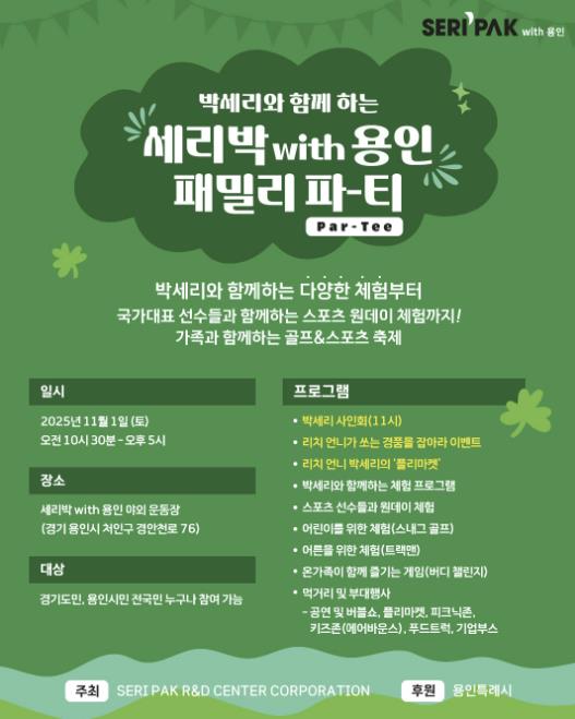 [무한뉴스=정윤식 기자] 용인특례시는 11월 1일 오전 10시 30분부터 오후 5시까지 처인구 경안천로 76에 위치한 ‘SERI PAK with 용인’ 야외운동장에서 골프 레전드 박세리 전 감독과 함께하는 ‘SERI PAK with 용인 패밀리 파티(Par-Tee)’를 개최한다고 21일 밝혔다.