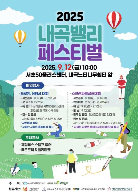 [무한뉴스=정승훈 기자] 서울 서초구는 오는 9월 12일, 서초50플러스센터와 내곡느티나무쉼터 앞에서 지역 주민과 함께하는 '2025년 내곡밸리 페스티벌'을 개최한다고 밝혔다.