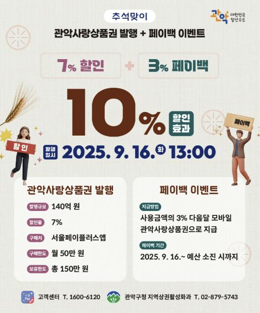 이번 추석맞이 관악사랑상품권을 구매하면 최대 10% 할인 효과를 누리게 된다. 먼저 2024년 이후 5%를 유지해 온 기존 상품권 할인율이 국비 2%의 지원을 받아 7%로 상향 적용되어 발행될 예정이다.