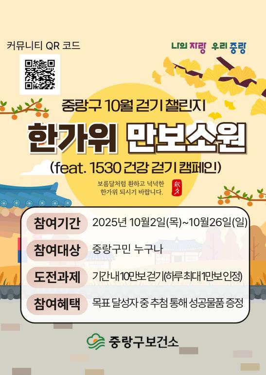 [무한뉴스=정승훈 기자] 중랑구는 모바일 걷기 앱을 활용한 '온라인 걷기 챌린지'를 10월 2일부터 26일까지 25일간 운영한다. 이번 챌린지는 구민들의 일상 속 걷기 실천율을 높이고, 건강한 생활습관을 유도하기 위해 마련됐다.