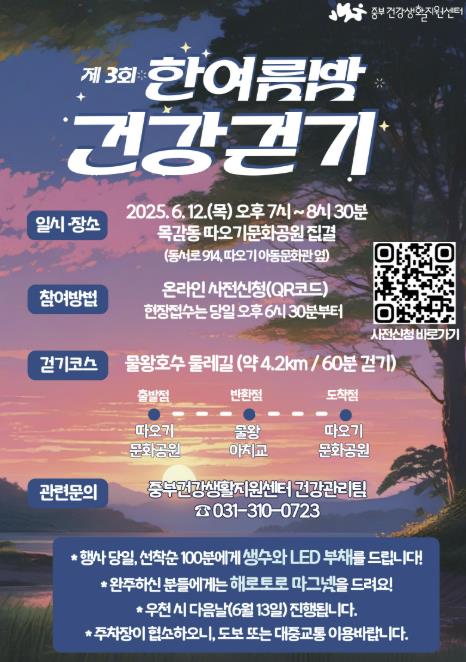 [무한뉴스=정승훈 기자] 시흥시 중부건강생활지원센터는 6월 12일 오후 7시부터 8시 30분까지, 목감동 따오기문화공원(동서로 914)에서 제3회 한 여름밤 건강걷기 행사를 개최한다. 이번 행사는 무더운 여름철 신체활동이 줄어들기 쉬운 시민들에게 자연 속 걷기 경험을 제공하고, 걷기 실천을 장려하기 위해 마련됐다.