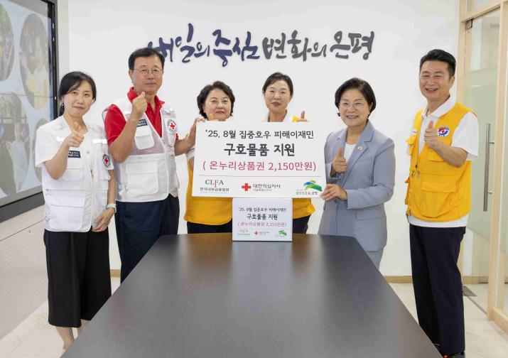 김미경 은평구청장은 “지난 8월 수해 당시 적십자사가 가장 먼저 달려와 복구 지원과 세탁 차량을 지원해 주셔서 큰 힘이 됐다”며 “기부금을 후원해 주신 한국대부금융협회에도 감사드리며, 이번에 전달받은 온누리상품권은 취약계층 수해 구민들의 회복을 위해 소중히 사용하겠다“고 밝혔다.