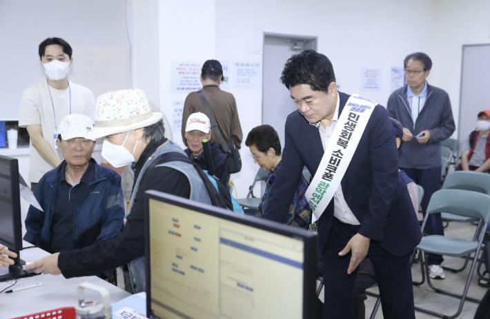 | ▲ 2차 민생회복 소비쿠폰 접수를 시작한 은천동 주민센터에서 민원인을 안내하는 박준희 관악구청장 |