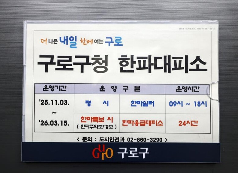 한파쉼터 및 응급대피소 위치와 운영시간 등 자세한 사항은 구로구 누리집과 누리소통망(SNS)을 통해 확인할 수 있으며, 문의는 도시안전과로 하면 된다.