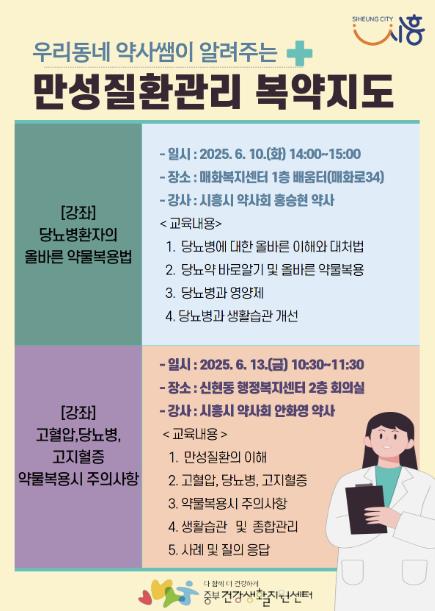 이번 강좌는 시흥시 약사회 소속 약사가 직접 강의하며, 당뇨병, 고혈압, 고지혈증 등 대표적인 만성질환에 대한 올바른 약물 복용법과 생활습관개선 방법을 알기 쉽게 전달할 예정이다.