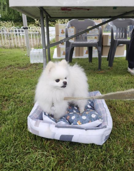 | ▲ 폐현수막으로 제작한 반려동물 쿠션 위에 있는 애완견 |