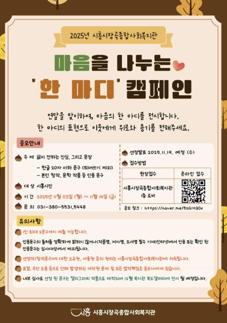 시흥시장곡종합사회복지관 관계자는 “짧은 문장이지만, 시민 한 사람 한 사람의 따뜻한 마음이 모여 이웃에게 큰 위로가 될 것”이라며 “많은 시민이 이번 캠페인에 참여해 따뜻한 시흥을 함께 만들어 주시길 바란다”라고 말했다.