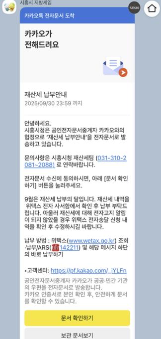 시는 지난 9월 17일 재산세 2,913건과 주민세 사업소분 12,662건에 대해 모바일 전자고지를 발송했으며, 해당 알림톡은 9월 30일까지 열람할 수 있다.