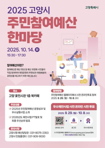 [무한뉴스=정승훈 기자] 고양특례시는 오는 10월 14일 오후 3시 30분, 일산호수공원 고양꽃전시관(북카페)에서 ‘2025년 고양특례시 주민참여예산 한마당’을 개최한다고 밝혔다.