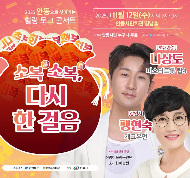 [무한뉴스=최진수 기자] 경상북도와 경북문화재단 주최․주관하고 안동시가 협력하는 ‘찾아가는 힐링 토크콘서트-소복소복 다시 한 걸음’이 11월 12일 오후 7시, 안동시민회관 영남홀에서 개최된다.