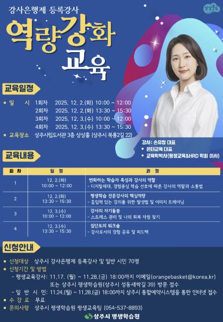 [무한뉴스=최진수 기자] 상주시는 11월 17일부터 11월 28일까지‘2025년 강사은행제 등록강사 역량강화 교육’수강생 70명을 모집한다.