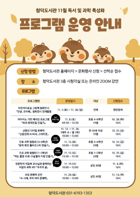 [무한뉴스=정윤식 기자] 용인특례시 청덕도서관은 11월 한 달간 다양한 과학 특성화 강의와 문해력 프로그램을 운영한다고 10일 밝혔다.