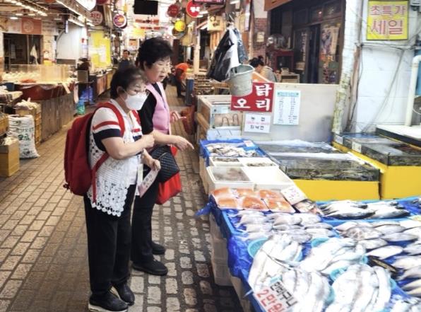 | ▲ 지역 어르신이 창4동 지역사회보장협의체 위원과 생선을 사고 있다. |