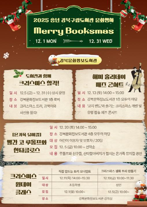 [무한뉴스=정승훈 기자] 서울 강북구는 강북구립도서관이 송년의 달과 크리스마스 시즌을 맞아 ‘2025년 강북구립도서관 송년의 달 기념 행사 Merry Booksmas(메리 북스마스)’를 운영한다고 밝혔다.