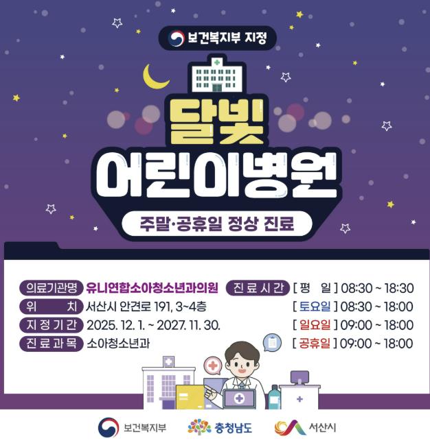 [무한뉴스=정민정 기자] 충남 서산시는 동문동에 있는 유니연합소아청소년과의원이 관내 1호 달빛어린이병원으로 지정됐다고 밝혔다.