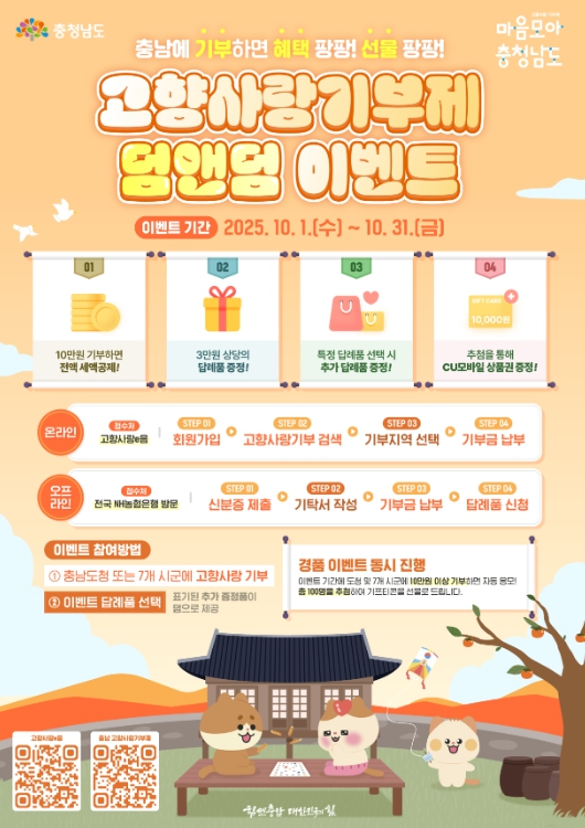 고향사랑기부제의 활성화를 위해 마련한 이번 이벤트는 도와 7개 시군에 10만원 이상 기부 시 기존 10만원 세액공제와 3만원 상당 답례품 외에 특정 답례품 선택 시 덤으로 추가 답례품을 증정한다.