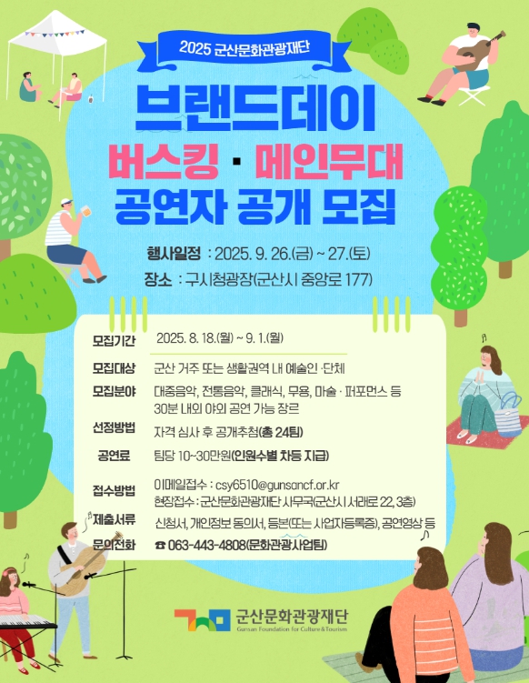 [무한뉴스=정민정 기자] (재)군산문화관광재단은 오는 9월 26일~27일 구 시청광장에서 열리는 '군산문화관광재단 브랜드 데이'에 참여할 ▲벼룩시장(플리마켓)·체험부스 운영자 ▲거리공연(버스킹)·메인무대 공연자를 모집한다.